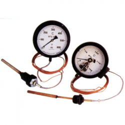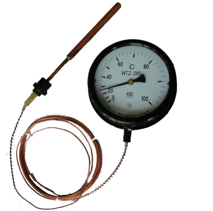 該溫度計的原理是基于密閉測溫系統內蒸發液體的飽和蒸氣壓力和溫度之間的變化關系,而進行溫度測量的。當溫包感受到溫度變化時,密閉系統內飽和蒸氣產生相應的壓力,引起彈性元件曲率的變化,使其自由端產生位移,再由齒輪放大機構把位移變為指示值,這種溫度計具有溫包體積小,反應速度快、靈敏度高、讀數直觀等特點,幾乎集合了玻璃棒溫度計、雙金屬溫度計、氣體壓力溫度計的所有優點,它可以制造成防震、防腐型,并且可以實現遠傳觸點信號、熱電阻信號、0-10mA或4-20mA信號。是目前使用范圍最廣、性能最全面的一種機械式測溫儀表。